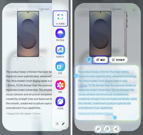 更进一步,三星Galaxy手机不仅能够快速执行用户指令,还能预判用户的操作意图。借助“AI多截图”功能,当用户截取网页、视频、文件中的某段内容时,系统会识别其中的文字、图像或视频信息,并根据内容类型推测用户可能的下一步需求,主动呈现例如摘要、翻译、甚至制作GIF动图等选项,让用户从想法到结果更快抵达。