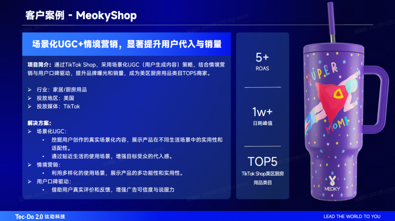 对于厨具品牌Sumetas,目标是在竞争白热化的美国市场,快速建立“高品质烹饪生活”的品牌认知,并在关键销售节点实现爆发。钛动科技为其部署了 “精准达人筛选+深度内容共创+全链路数据投流” 的一体化方案,构建一个可持续的达人内容循环。整合达人资源,严格筛选一批符合品牌调性的专注美食、生活美学的垂类TikTok达人进行长期合作,与达人共创“厨房美学”等系列定制化内容;在“黑五”大促期间,钛动科技将达人内容与品牌自有素材智能混剪,形成海量、多元且高质量的广告素材库,将开箱、穿搭、场景化展示等高质量共创内容作为核心资产,突出产品使用场景与健康生活方式的高度关联;通过钛动科技的全链路代投服务进行精准人群触达与高效转化,投放系统实时优化广告组合的转化效率,动态分配预算,确保最具吸引力的叙事内容获得最大曝光实现精准投放;实时监测投放效果,快速调整素材与受众,进行数据复盘迭代。最终实现日消耗稳定超过1万美元,成功助力Sumetas在黑五期间的TikTok电商总榜冲击至TOP2 席位。达人生态不仅带来了流量,更以其专业、可信的“品味背书”,为Sumetas贴上了“品质生活创作者”的鲜明标签,实现了品牌价值的提升。