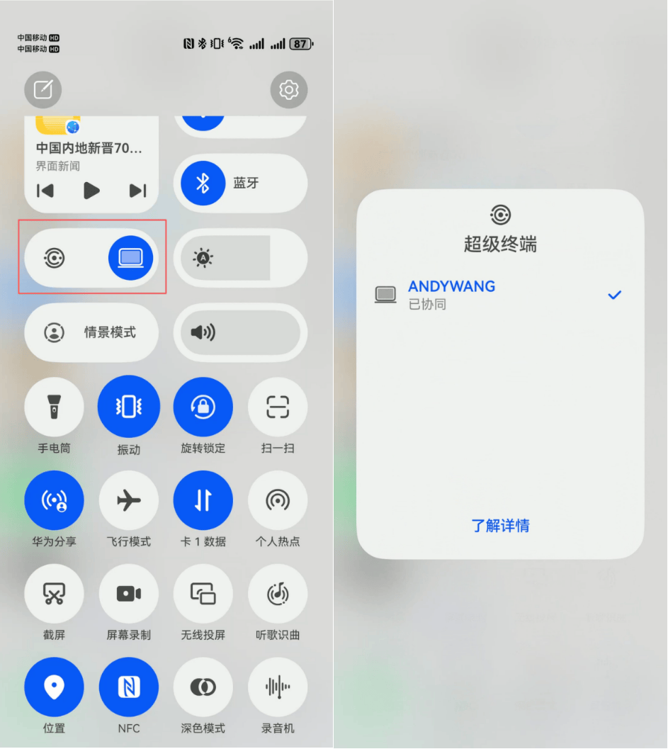 刚开始用的时候,还担心连接会很复杂,毕竟以前用其他品牌的多屏协同功能,光是配对就要折腾半天,有时候还会断连。但HarmonyOS 6的连接逻辑真的很简单,要么把手机和电脑NFC感应区碰一碰,要么在电脑状态栏打开超级终端,找到手机图标拖过去,两秒就能连好;或者打开手机控制中心,在“超级终端”里一眼看到我的电脑名称,点击都能实现“多屏协同”。笔者试过在办公室、咖啡馆、家里不同环境用,基本没遇到过断连的情况,就算不小心把手机拿开,再放回去也能快速重新连接,点击一键回连,不用反复设置。