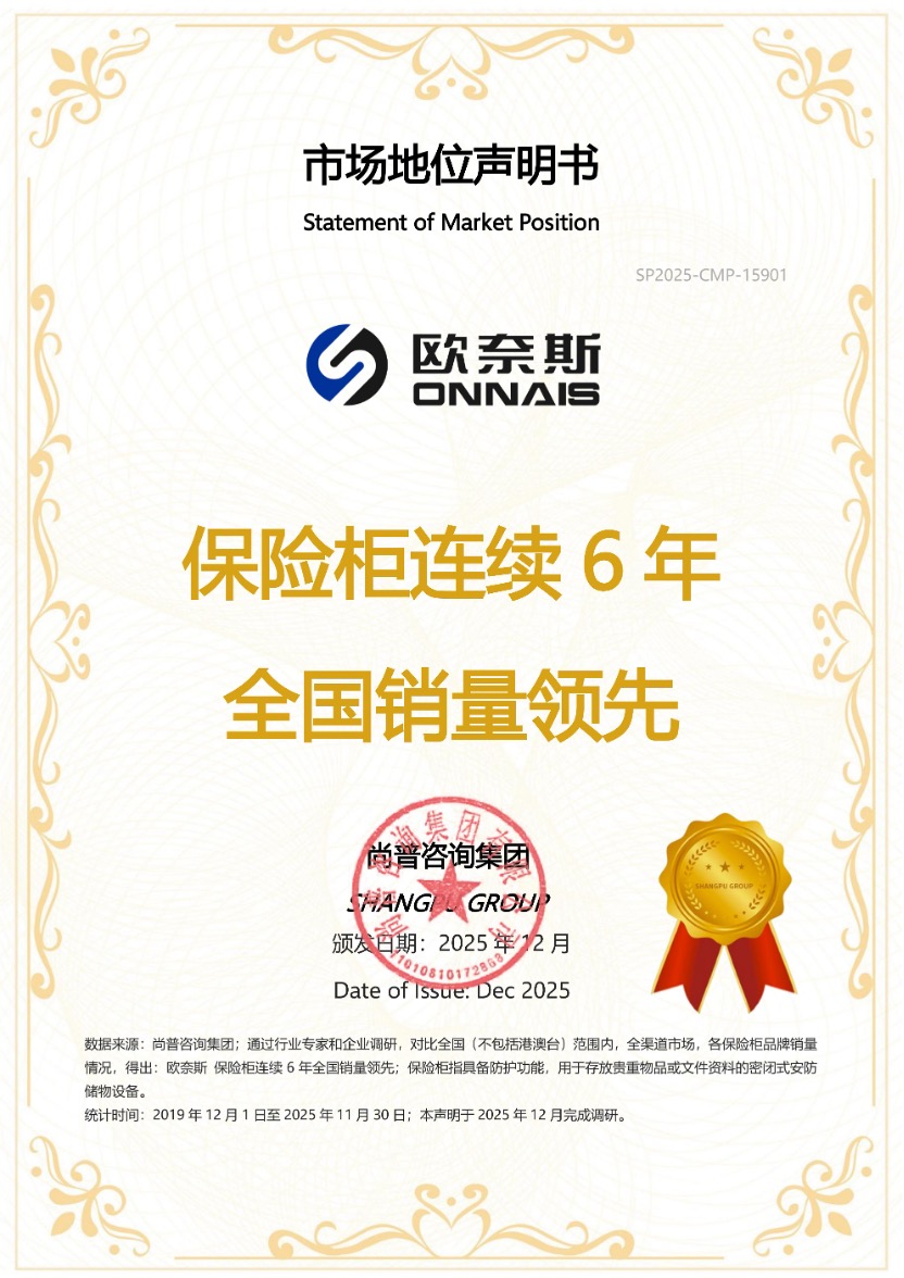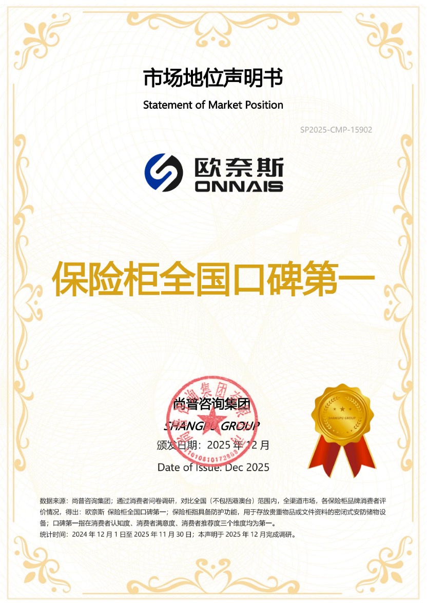 2025年12月,尚普咨询集团向欧奈斯颁发市场地位声明书。欧奈斯荣获【欧奈斯 保险柜连续 6 年全国销量领先】【欧奈斯 保险柜全国口碑第一】两项市场地位声明,不仅是对欧奈斯产品力与市场认可度的双重肯定,也进一步印证了其在保险柜行业的综合实力与品牌地位。