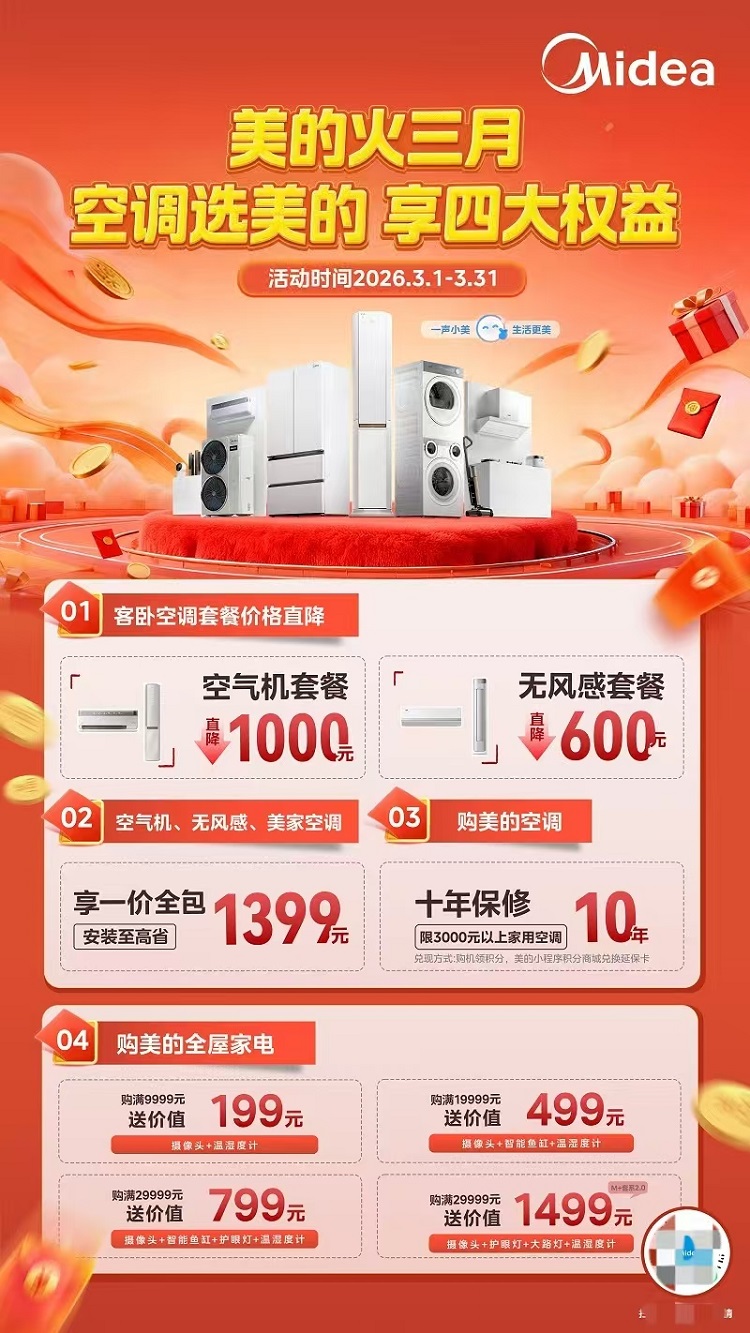 万维君从美的官方获悉,此次美的“火三月”活动将持续至3月31日,美的空气机套餐直降1000元、无风感套餐直降600元,购3000元以上家用空调享10年保修,所有福利均在美的智慧家线下门店同步开启,消费者到店即可享受这一核心福利,无需担心上门后被临时加价、强制消费,真正做到“明明白白消费、安安心心用机”。