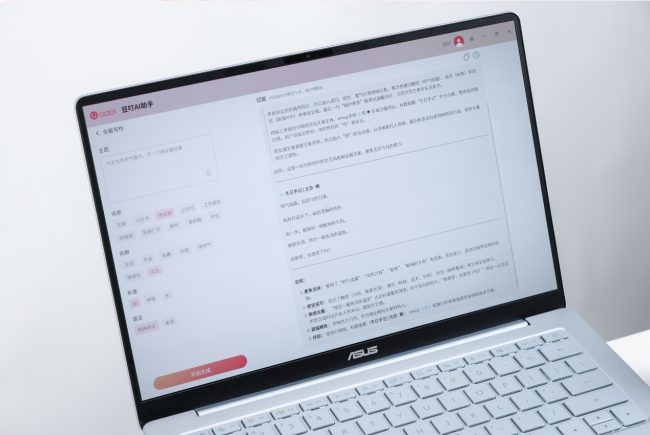 华硕a豆14 Air 2026的AI功能也精准戳中年轻人需求,全新升级的豆叮AI助手新增Q版AI朵皮肤,基于端云一体AI大模型,不仅断网也能继续使用。还支持AI PPT、AI绘图、AI写代码、AI文件搜索、全能写作等实用功能,辅助你高效完成工作,大幅节省时间。而且还新增AI桌宠功能,可自定义主题人物,可爱动态表情随操作响应,兼顾效率与治愈感,让办公更有乐趣。