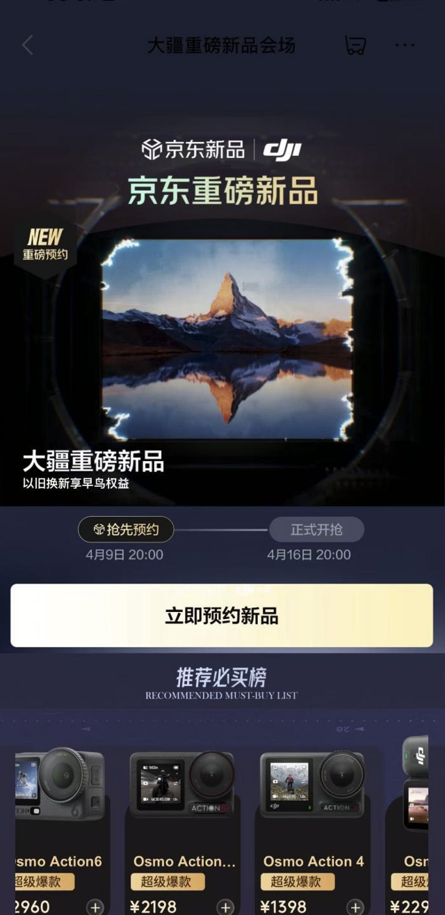 从4月9日20:00起,京东与大疆联手打造的影像盛宴将正式拉开帷幕。4月10日10:00,首场“盲拍”将鸣锣开拍。现在打开京东APP,搜索“大疆上新日”即可直达专属预约页面,抢先锁定多重早鸟权益,最高立减450元;搜索“京东拍卖”更有盲拍活动等你参与,赢取全额免单机会,先人一步开启高质量影像创作之旅。