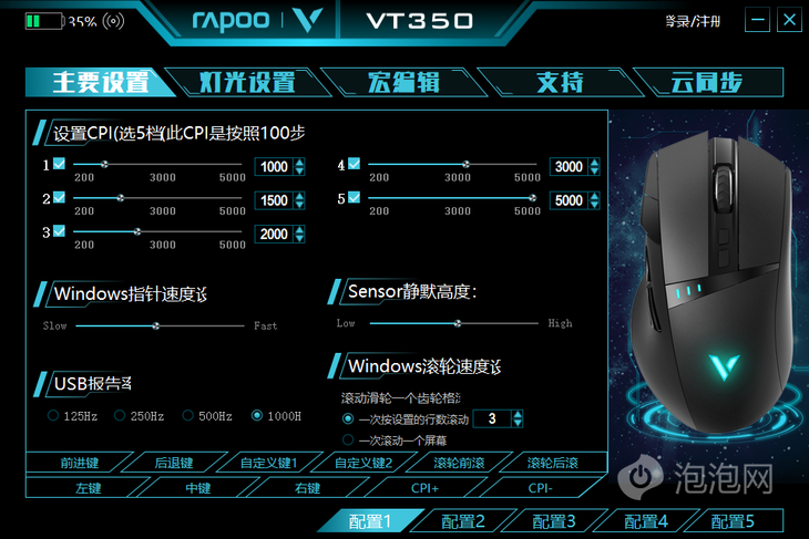 雷柏VT350的驱动页面分为五个部分,在主页面可以对五档CPI数值、指针速度、滚轮速度、Seneor静默高度以及USB报告率以及十一颗按键的自定义设置进行调整,并且可以保存五组配置,在无线连接模式下,驱动软件的左上角可以实时显示鼠标剩余电量。