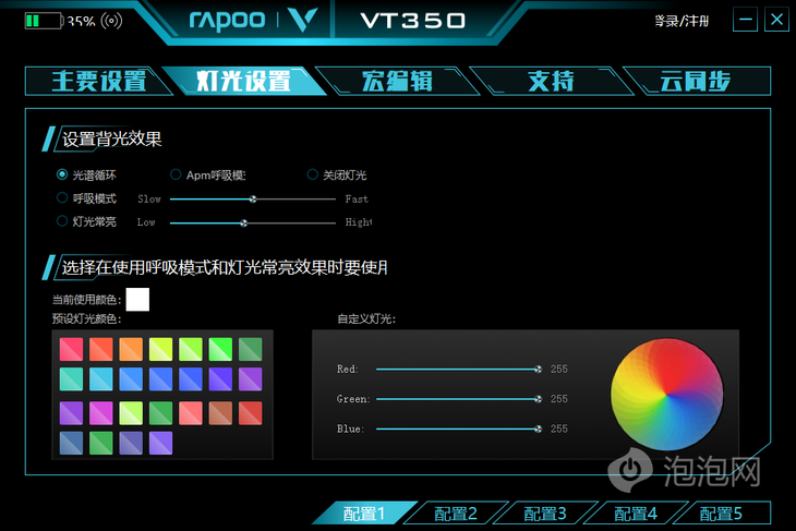 第二页的灯光设置部分可设置的是鼠标正面的VT标志灯光相关参数,其中包括灯光颜色、灯光模式等参数,鼠标正面的VT标志灯光有着约1680万色背光系统的支持,这一背光灯同时支持在无线模式下的电量警示作用,在低电量模式下将会闪烁红光提醒玩家,及时充电或使用有线模式。