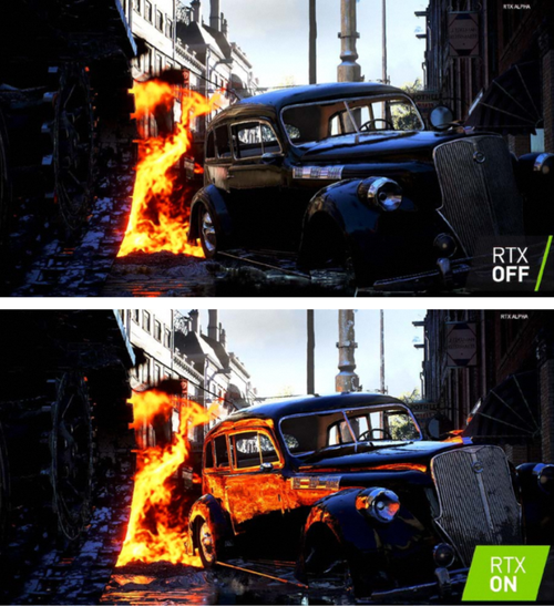 前文我们说到,RT Cores占用了很大的核心面积,而这些单元并不会提升传统的光栅渲染效能。他们的用途要比单独提升游戏的FPS值更有价值。基于这些单元,NVIDIA在这一代显卡产品中加入了酝酿多年的“实时光线追踪”(RTX)技术。这也是为什么这一代显卡产品的命名从“GTX”变成“RTX”的原因。