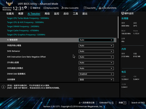 作为专业级电竞主板,超频选项自然也是必不可少,在AI Tweaker界面中,用户可以自行设置超频的选项,其中包含有CPU、内存等相关设置。