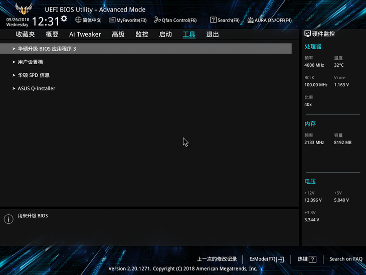 华硕旗下的主板产品所应用的UEFI BIOS Utility图形化BIOS界面在同类产品中以简单、直观、逻辑清晰、操作便捷广受消费者欢迎,在全新的TUF Z390-PLUS GAMING主板上自然也被沿用下来。