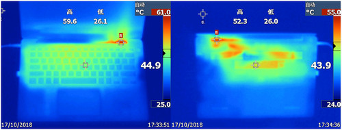 我们使用 AIDA 64进行满载测试,连续烤机1小时后我们使用热成像仪对笔记本温度进行检测,从图中我们可以看出,在满载情况下,主要温度都集中在笔记本散热风扇出风口处。