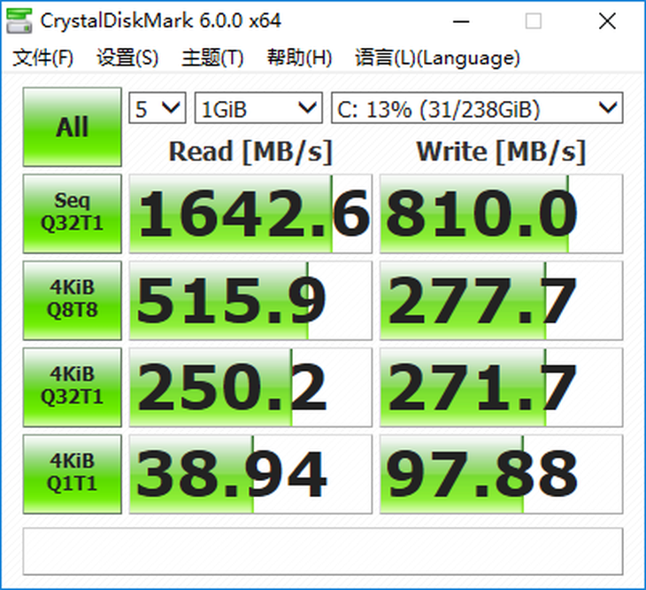 戴尔灵越5488使用了一块海力士出品的BC501 NVMe 256GB固态硬盘,连续读取成绩达到1642.6MB/s,连续写入成绩达到810MB/s,有着不错的读写成绩,可以为用户带来高速大容量存储空间。