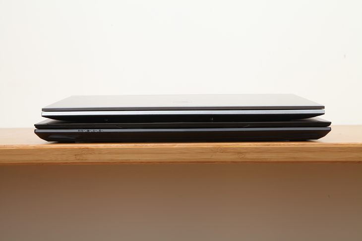 由于深海幽灵Z2 Air采用了窄边框设计,而神舟Z7为传统设计,所以长宽尺寸上神舟Z7相对于机械革命Z2 Air均要大上2厘米左右。因此两款笔记本放在一起,可以非常直观地感受到尺寸上的显著差异。更加苗条的Z2 Air在颜值上也获得了很大的加分,和神舟Z7给人的笨重感觉形成了鲜明的对比。而厚度方面就更加明显了,我们来换个角度观察一下。