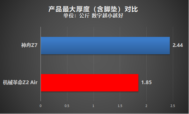而搭载了MAX-Q版本GTX 1060显卡的机械革命Z2 Air的最大厚度(含脚垫)仅仅23mm左右。如果用柱状图来表示的话,应该是这样的: