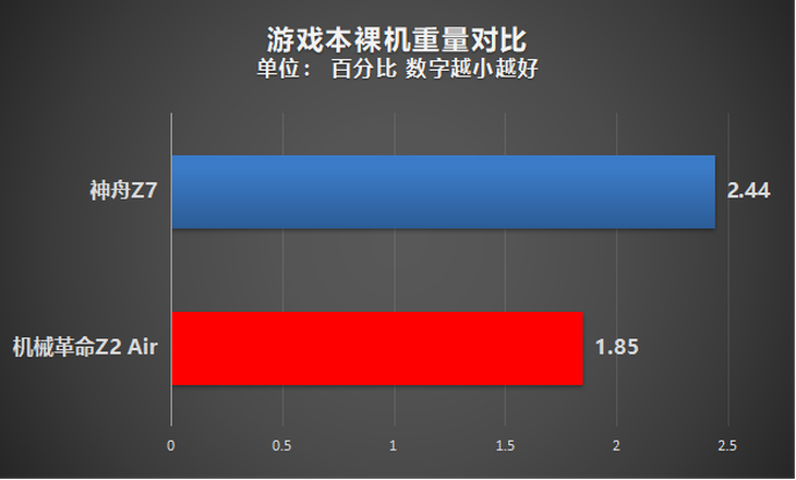 裸机状态下,神舟Z7的重量达到了2.44公斤,这样的重量其实在传统15.6英寸游戏本中属于正常水平,而使用MAX-Q技术的机械革命Z2 Air的重量却仅有1.85公斤,几乎可以媲美部分商务本产品。