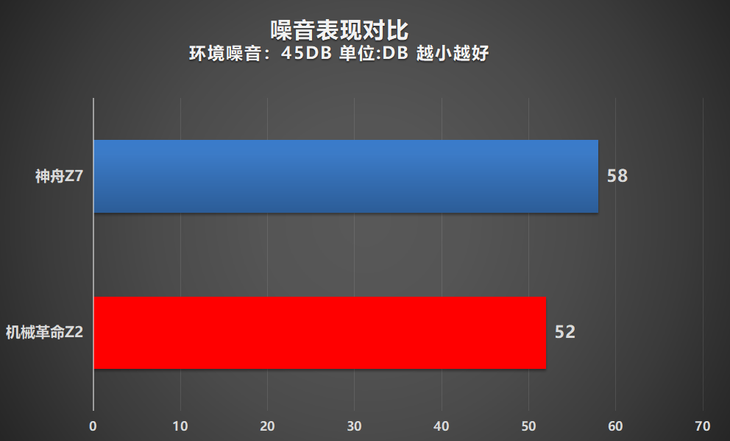 可以看到,搭载MAX-Q技术的机械革命Z2 Air相比传统游戏本的代表神舟Z7,噪音明显更低,也更加安静。