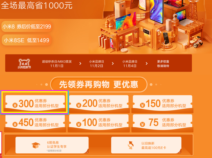 重点!在京东点开小米双十一狂欢节页面可以领取小米8 300元优惠卷,最终到手价最低2199元,对于一台骁龙845旗舰机来说这个价格可以说是非常超值了。优惠卷每天数量有限先到先得,喜欢的小伙伴可千万别错过。