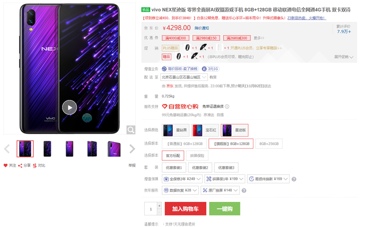 领卷减450,普通版到手价2848这款手机,但是这款机器还是要推荐8+128GB的旗舰版,屏下指纹很炫酷还保护了后盖一体性,售价4298元,领卷减450到手价3848。vivo NEX这款手机虽说在骁龙845旗舰里并不便宜,但性价比不是便宜而是物超所值,感觉就冲这屏占比、升降摄像头、配置、屏下指纹和配色就相当有性价比了。普通非京东PLUS会员的用户购买送一个乐心手环加一把雨伞,京东PLUS会员多送一个5000mAh充电宝。