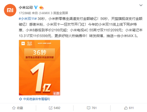双十一全球购物节火爆开启,小米官方微博宣布仅仅用了36秒时间,新零售渠道支付金额突破亿元大关。天猫旗舰店支付金额破亿,可谓是双十一的开门红。