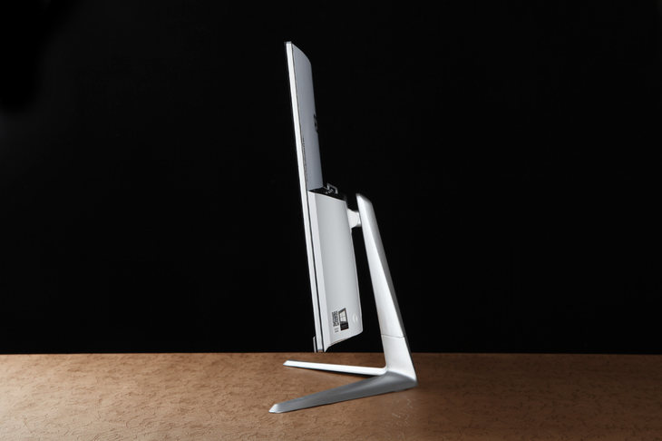 这款一体机的背面采用分段式的结构,整体表面整洁干净,接口区域集中在屏幕背面的左下方。