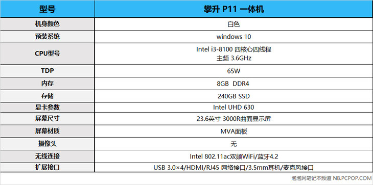 我们拿到的这款攀升P11一体机采用23.6英寸 MVA屏幕,内置八代酷睿i3-8100 四核心四线程处理器,8GB内存,240GB固态硬盘,屏幕分辨率为1920×1080。