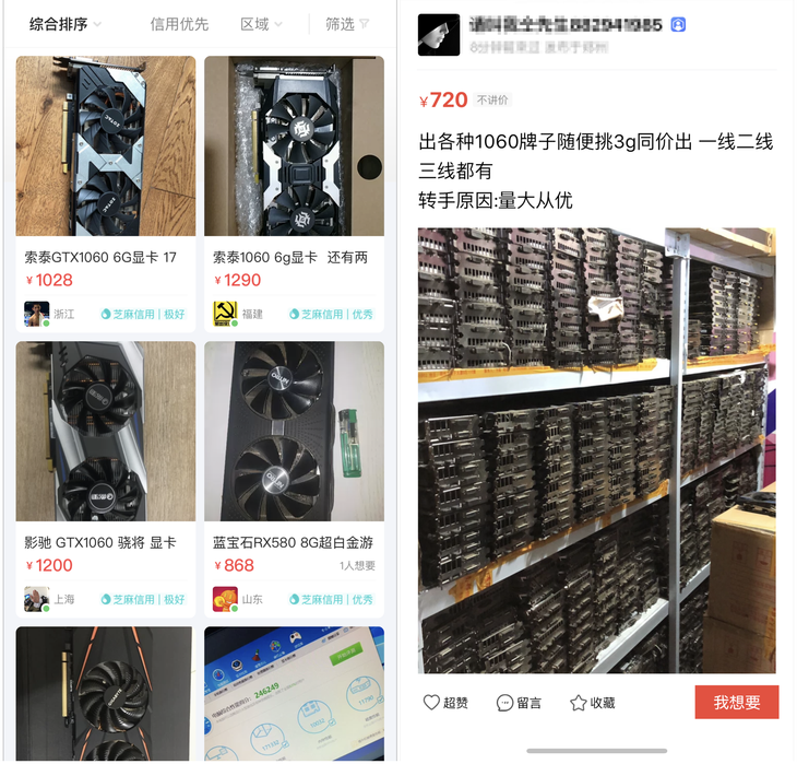 即使是小型矿主,投资的显卡数量往往也在数百到上千张,这些显卡在虚拟币价格高涨的时期7x24小时满负载运转,为矿主们创造了大量财富。而一旦虚拟币价格崩盘,这些显卡的命运就要发生逆转了。