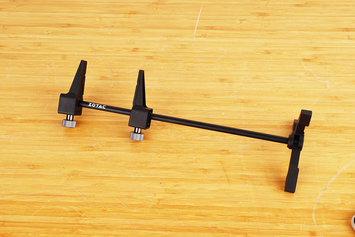 随索泰 RTX 2080Ti PGF OC版一起来到我们评测室的还有看上去帅气十足的显卡支架。