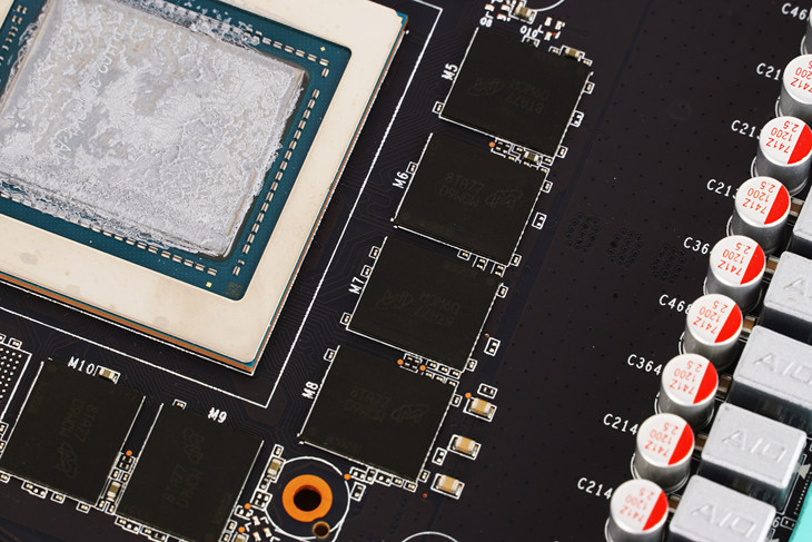 通过GPU周围的显存颗粒我们可以看到,索泰 RTX 2080Ti PGF OC版在显存方面采用了来自镁光的GDDR6,单颗容量1GB,共8颗,等效频率14000MHz。
