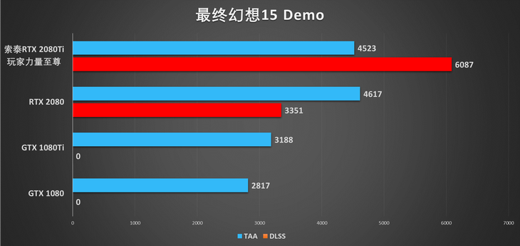 而利用《最终幻想15》对NVIDIA RTX 20系显卡的DLSS深度学习能力进行测试中,索泰 RTX 2080Ti PGF OC版在TAA测试中表现出超出上代旗舰级GTX 1080Ti近42%的优势,而在DLSS深度学习采样技术的加持下,这款显卡在《最终幻想15》的Demo中也取得了6087的优异成绩,可见RTX 2080T在4K最高画质下可以完美运行。
