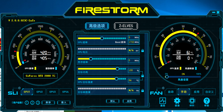 FireStorm在主界面可以看到显卡的基本信息,包括显卡型号、风扇设置、GPU温度、CPU频率、显存频率等多项实时信息。在界面右侧则可通过调节GPU频率、GPU电压、显存频率、目标功耗等数值。