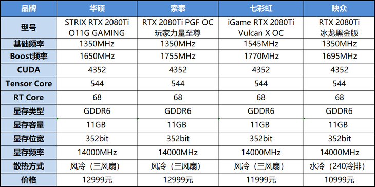 以上这样的散热成绩除了散热器本身的差距之外,还与显卡本身的频率有着直接的关系,可以看出频率相对较高的七彩虹和索泰显卡温度相对较高,而频率1650MHz的华硕在优秀的散热器加持下获得良好成绩也就在情理之中了。而采用水冷的映众RTX 2080Ti冰龙黑金的较好成绩则没有任何悬念。