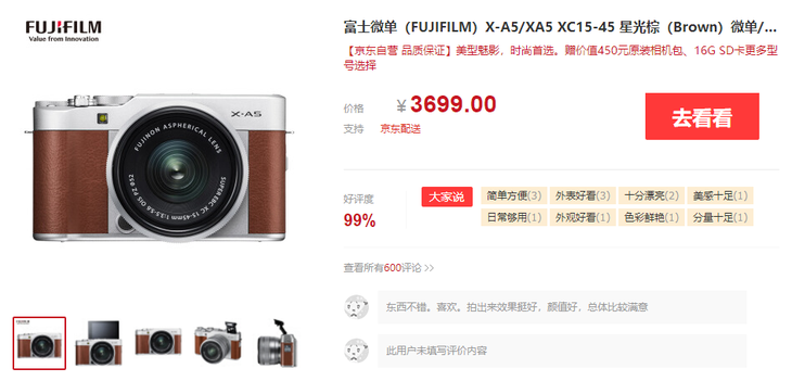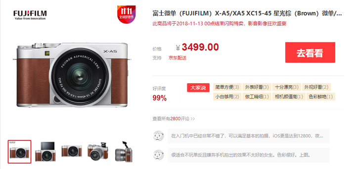 复古文艺造型微单相机 富士X-A5套机跌至3199元