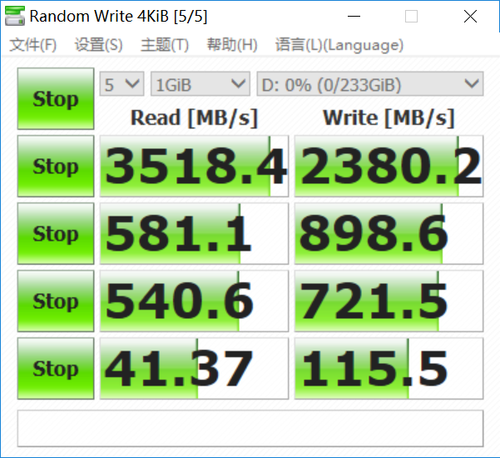 CrystalDiskMark同样是一款测试电脑硬盘的检测工具,可以测试存储设备的读写速度等信息。通过测试,三星970 EVO Plus持续读写成绩表现出了与规格信息非常接近的优异成绩。最大持续读取速度达到夸张的3551.5MB/S,而最高写入速度也达到了2376.9MB/s,传输速度优异。