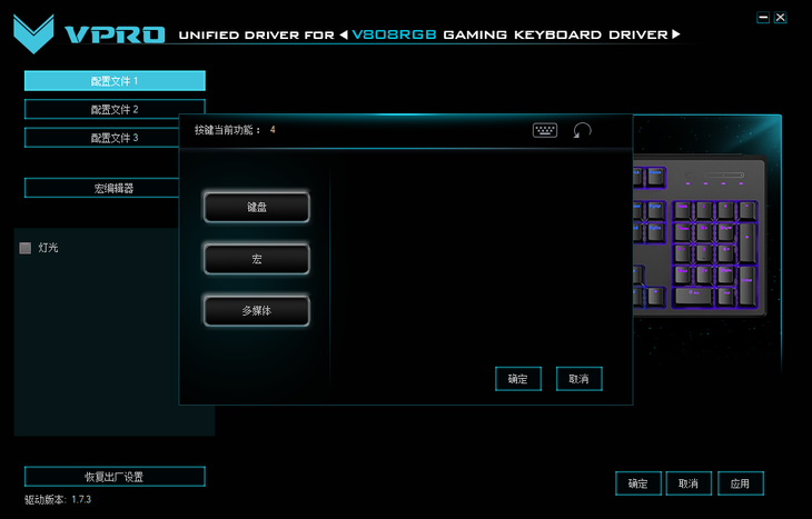雷柏为每一款机械键盘都配有专门的驱动程序,V808 RGB同样不例外,通过官网下载即可获得最新的驱动程序。在驱动主界面,雷柏为用户准备了三套可配置方案。右侧则是雷柏V808RGB键盘图示。