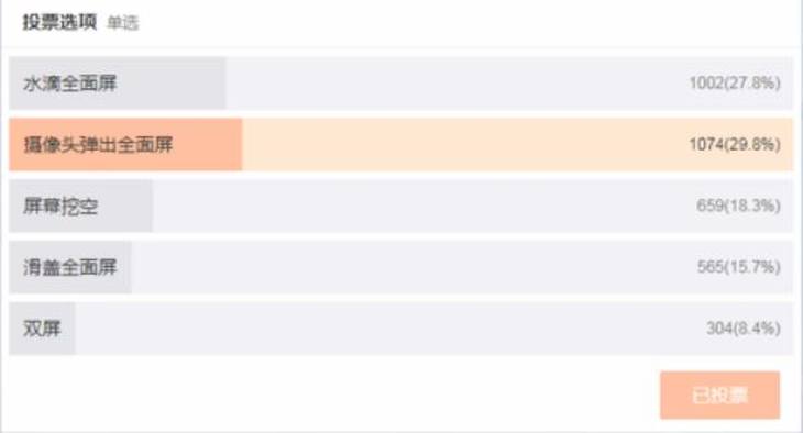 在前不久小米副总裁、Redmi总经理卢伟冰在微博发起的【对于全面屏,你会更加认可哪个方向?】投票。其中获得认可最多的当属“弹出摄像头全面屏”。