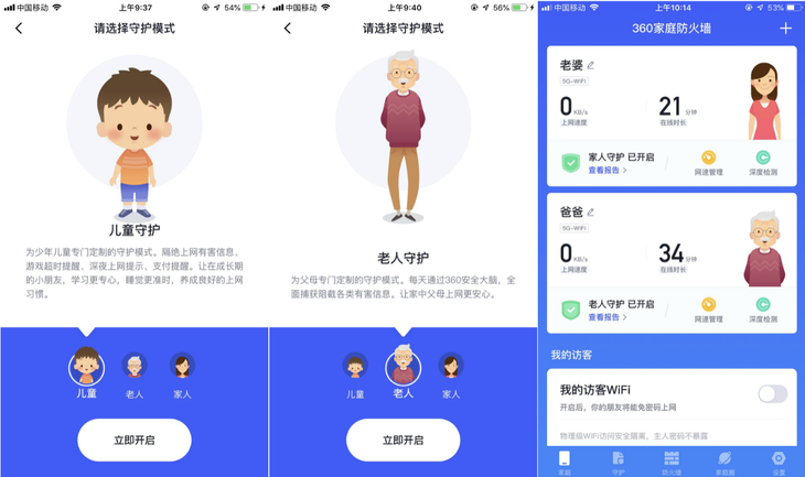 那么360安全防火墙路由器如何确保家庭成员使用无线网络的安全呢?其实大体上可以归结为三类守护。首先就是对儿童和老人的守护,360安全防火墙路由器拥有“儿童守护”和“老人守护”模式,来保护家中的老人和小孩不受不良网站和网络黑洞的危害;同时,360安全防火墙路由器也会对家中的IoT设备进行守护,从而确保家中的智能设备不会存在安全漏洞,避免家庭财产和隐私方面的损失。