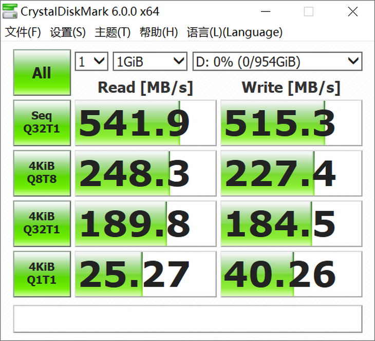 跑分部分首先是比较专业的跑分软件CrystalDiskMark,可以看到,持续读取成绩达到了541MB/s,写入则同样超过了515MB/s。4K性能也比较理想。很明显,这样的成绩符合一枚SATA协议移动SSD的性能水平。