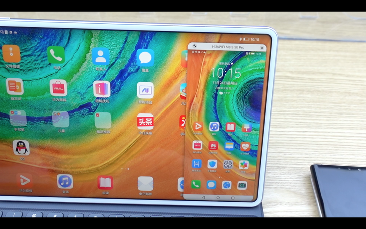 第二是多屏协同。多屏协同解决的是不同终端的连接问题。它利用分布式技术聚合了多终端的硬件能力,做到不同终端间可以相互共用硬件,也能用拖拽的方式快速分享数据,而且这一切都是基于无线实现的,这为我们带来了极大的便利。例如,我将手机与华为MatePad Pro连接,手机界面就会投屏至平板上,并以一个窗口的形式存在,这时我通过触控平板上的屏幕也能操控手机,同样,我还能用平板的蓝牙键盘在手机上输入文字,这种体验非常高效。