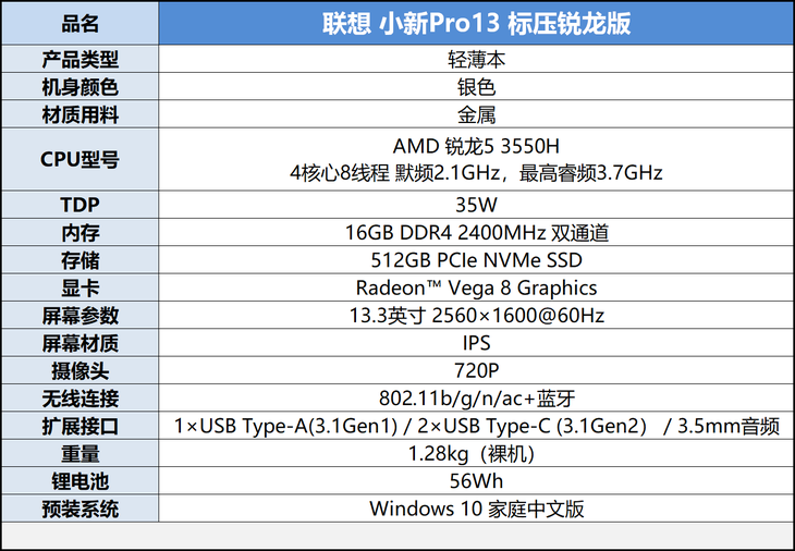 目前小新Pro 13标压锐龙版只有一个版本在售,使用标压锐龙5 3550H处理器,与锐龙5 3500U同样的12nm Zen+架构,同样采用4核心8线程设计,但TDP提高到了35W,性能有着进一步的提升。内存方面,联想贯彻了近期的大方作风,16GB DDR4 2400双通道满满当当。显卡方面是处理器配套的Radeon Vega 8,共8组CU单元。另外无线网卡更换成了一款最高支持ac协议的产品。除此了上述硬件之外,2K分辨率的屏幕以及SSD、接口、电池等配置与普通版小新Pro 13没有区别。