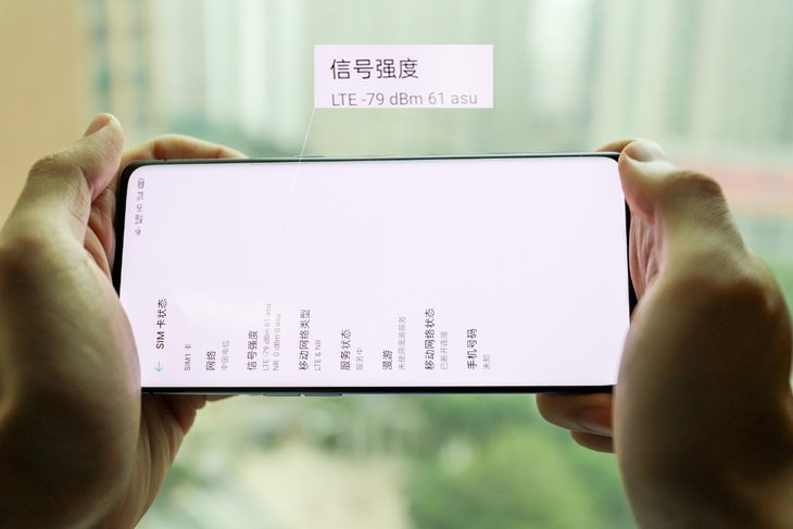 玩游戏时比较常见的就是横向握持姿势,这种握持姿势对天线的遮挡更加严重,比较容易影响天线信号。Reno3 Pro的360度环绕式天线设计能够更好应对这种握持姿势。横向握持时信号仍旧为满格,信号强度为-79dBm,和竖向握持时很接近,同样拥有不错的信号质量。