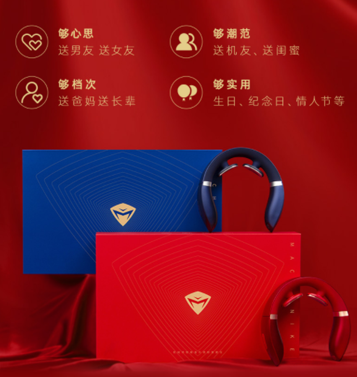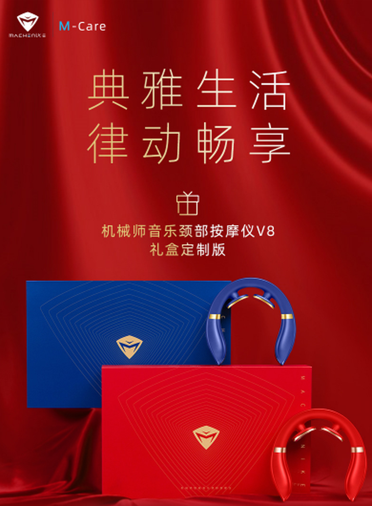 礼盒外观以象征着喜庆的元素为主,夹杂着些许的金色几何的解构关系,形成一种奇妙的视觉符号,张扬个性却又不失高级。正面是机械师的logo,整体的设计和包装都非常精致。定制礼盒包装,潮流风尚、典雅品格与舒适放松融为一体。是逢佳节纪念日送给周围亲朋好友的礼物佳选,当然,智能颈椎按摩器才是礼盒中最好的新年礼物。这款按摩器有炽热红和冰河蓝两种配色,既显生活格调又兼得现代简约感。在给用户带来极致畅快体验的同时,配上与新年相关的音乐,在日常使用时也能随时感受到新年的气息。颈椎按摩器礼盒版是春节送礼的首选,如果你也对这款送礼佳选感兴趣,不妨去了解一下。