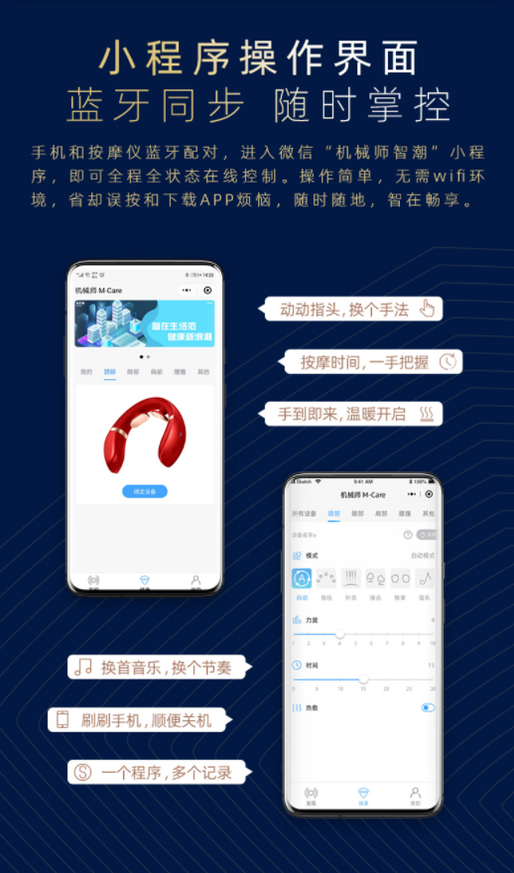 Machenike机械师音乐颈椎按摩器礼盒版,最吸引人的部分是创新性的采用了蓝牙5.0智控设计,操作秒同步,让你的按摩节奏一目了然。微信小程序可视化操作界面,使用手机与按摩仪蓝牙配对,进入微信搜索“机械师智潮”小程序,即可全程全状态在线操控。操作简单,省却按错键以及下载APP的烦恼。操作简单轻轻点按,动动手机就能操控按摩节奏,无论是买来送给自己使用,还是送给长辈使用都十分合适,随时随地都能来一个智能舒心的按摩。