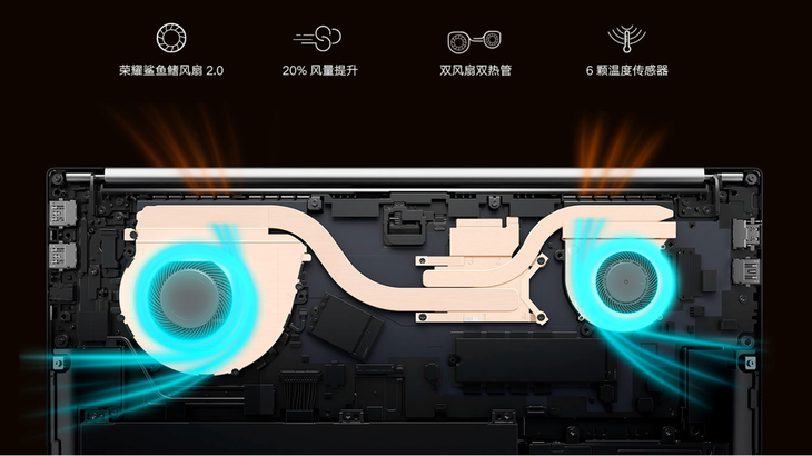 散热方面,搭载了鲨鱼鳍双风扇2.0版本,拥有更高转速和更大风量。同时配备6颗温度传感器实时监控机身内部温度,有效平衡风量降低风扇噪音。出色的散热能力也能更充分发挥硬件性能。