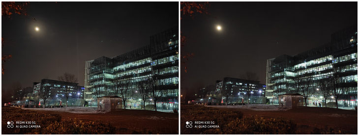 软件功能上,Redmi K30 5G支持超级夜景2.0,通过基于RAW域的夜景优化算法,获取更多的暗部信息,夜景拍照高光不过曝,暗部噪点更少、细节更丰富。