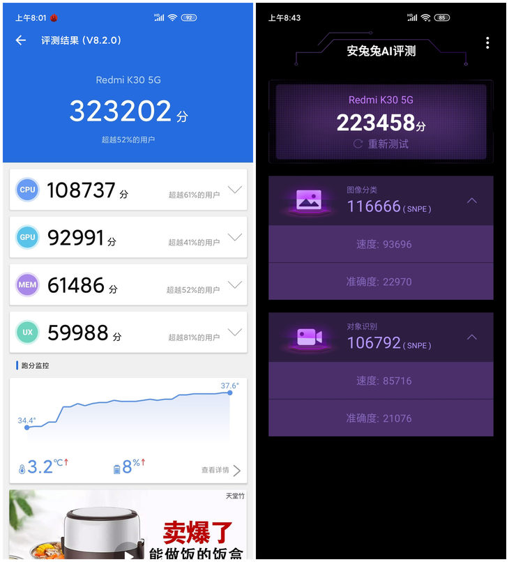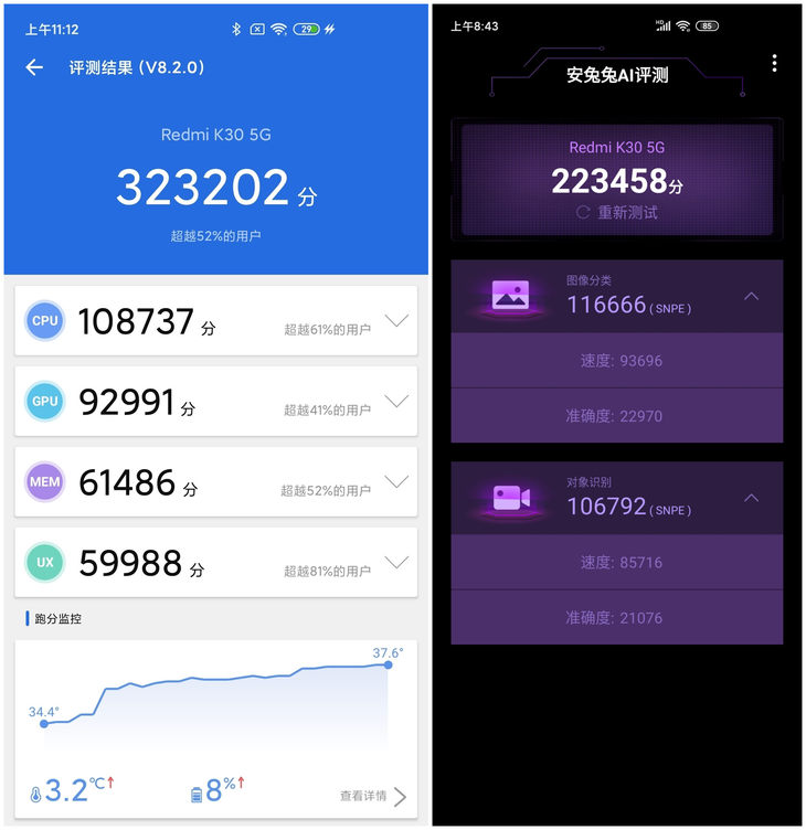 这些性能方面的升级也能够在跑分上有所体现,Redmi K30 5G的安兔兔跑分结果为323202分,AI测试的得分为223458分。