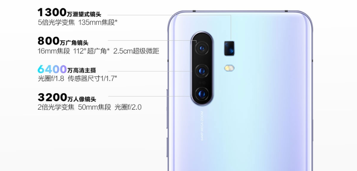 vivo X30 Pro的拍照硬件组合非常豪华,后置为6400万主摄+3200万人像镜头+1300万潜望式长焦镜头+800万广角镜头四摄组合,前置为3200万像素摄像头。