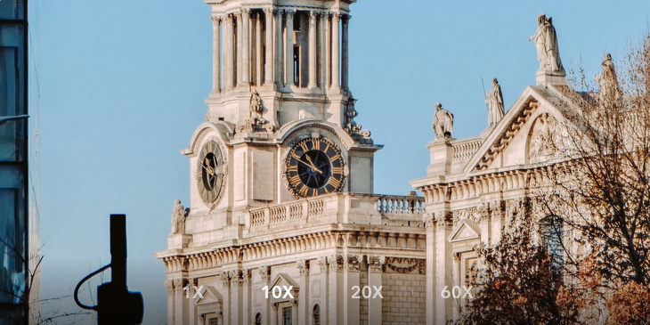 通过潜望式长焦镜头可以实现5倍光学变焦、10倍混合变焦、最高60倍数码变焦,其中5倍光学变焦和10倍混合变焦的成像质量都不错,能够带来更多的玩法。