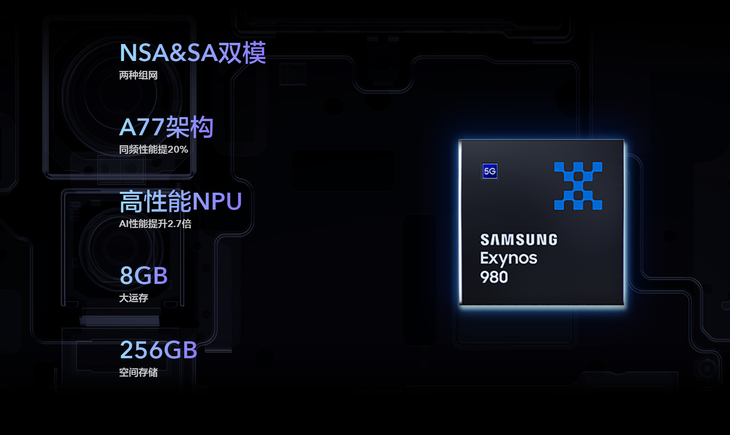 vivo X30 Pro搭载Exynos980双模5G SoC,支持NSA/SA双模5G,能实现最高2.55Gbps的下载速度,更全面的5G网络支持也能给用户带来更加省心的使用体验。Exynos980双模5G SoC还采用全新A77 CPU架构,GPU为Mali-G76 MP5,拥有高性能NPU和DSP处理单元,日常使用、玩游戏等需求都能更高效应对。