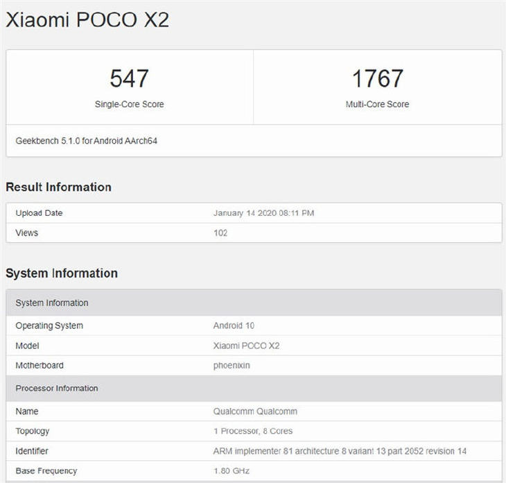 据GeekBench信息显示,在核心配置上,小米POCO X2搭载的是一款频率为1.80GHz的高通8核处理器,尚不清楚处理器具体是哪一款,配备安卓10操作系统,8GB的运行内存。前不久,外媒曝光了小米注册“POCO F2”商标,有网友猜测小米这是在为发布新机做准备。