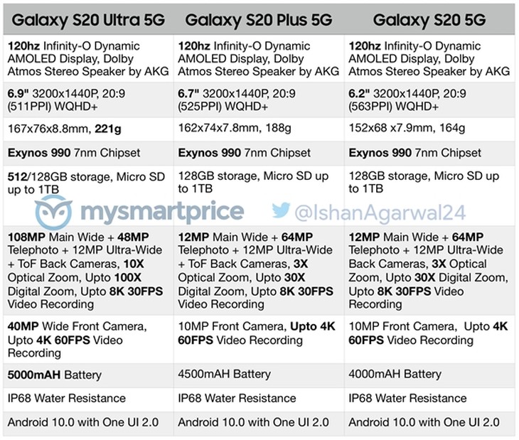 核心配置上,图中显示SoC采用了7nm的Exynos 990,但国内版本应该会是骁龙865。存储方面,均拥有128G起步的闪存,并支持通过SD卡拓展1T存储空间。电池容量上,Ultra版本达到了5000mAh,尺寸最小的Galaxy S20也有4000mAh。
