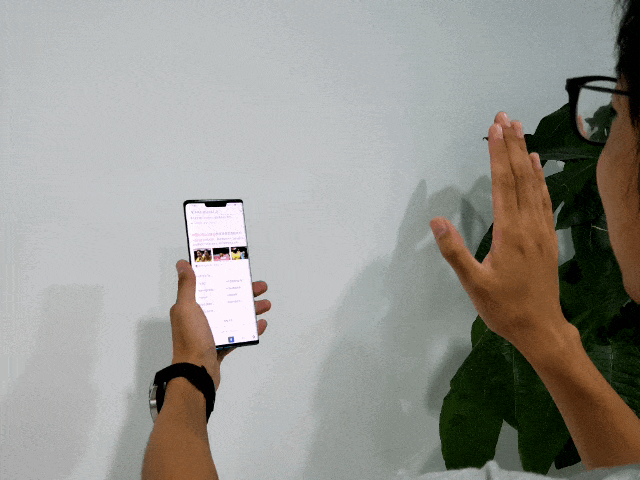 华为Mate30 Pro还给我们带来了AI隔空操控功能。通过前置姿态感应器+NPU组合,可以检测到隔空手势,无需接触屏幕就能实现操作。手脏不适合接触屏幕时,通过隔空手势就能实现上下滑动、截屏等操作,这些都是创新的交互方式。
