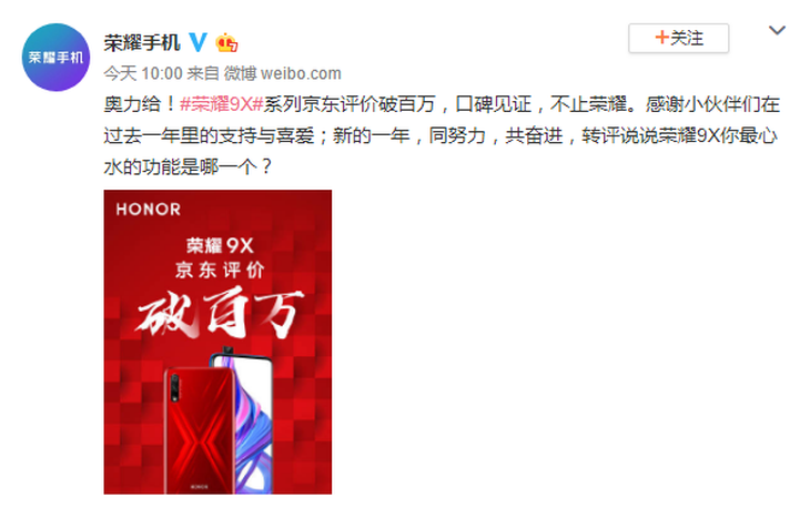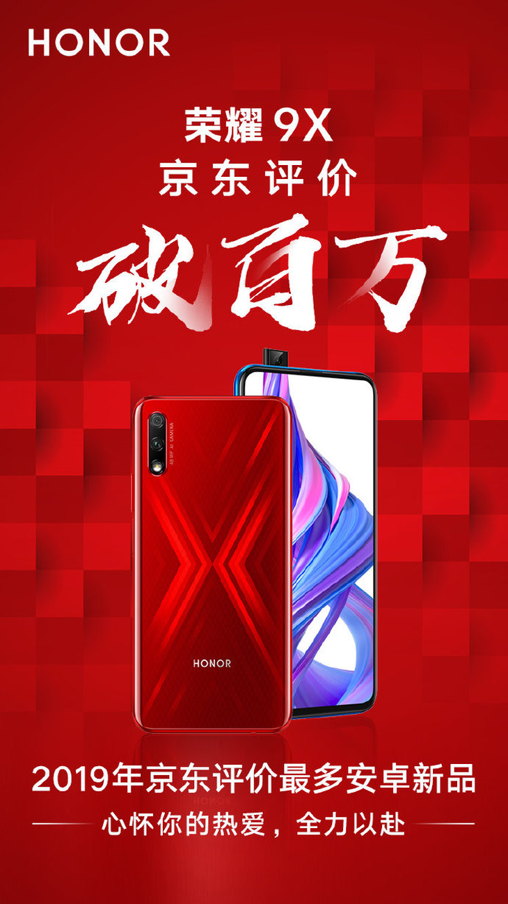 2月12日消息,今日,@荣耀手机 官方发布微博称,荣耀9X系列产品在京东的评价数量已超过100万。与此同时,荣耀9X也成为2019年京东评价最多的安卓新品。